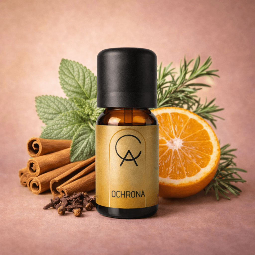 Olejek eteryczny OCHRONA to aromaterapeutyczna mieszanka funkcyjna, która może wspierać naturalną odporność organizmu. Zawiera sześć starannie dobranych olejków eterycznych, które tworzą kompozycję o ciepłym, energetyzującym aromacie – idealną do dyfuzji szczególnie w sezonie jesienno-zimowym.