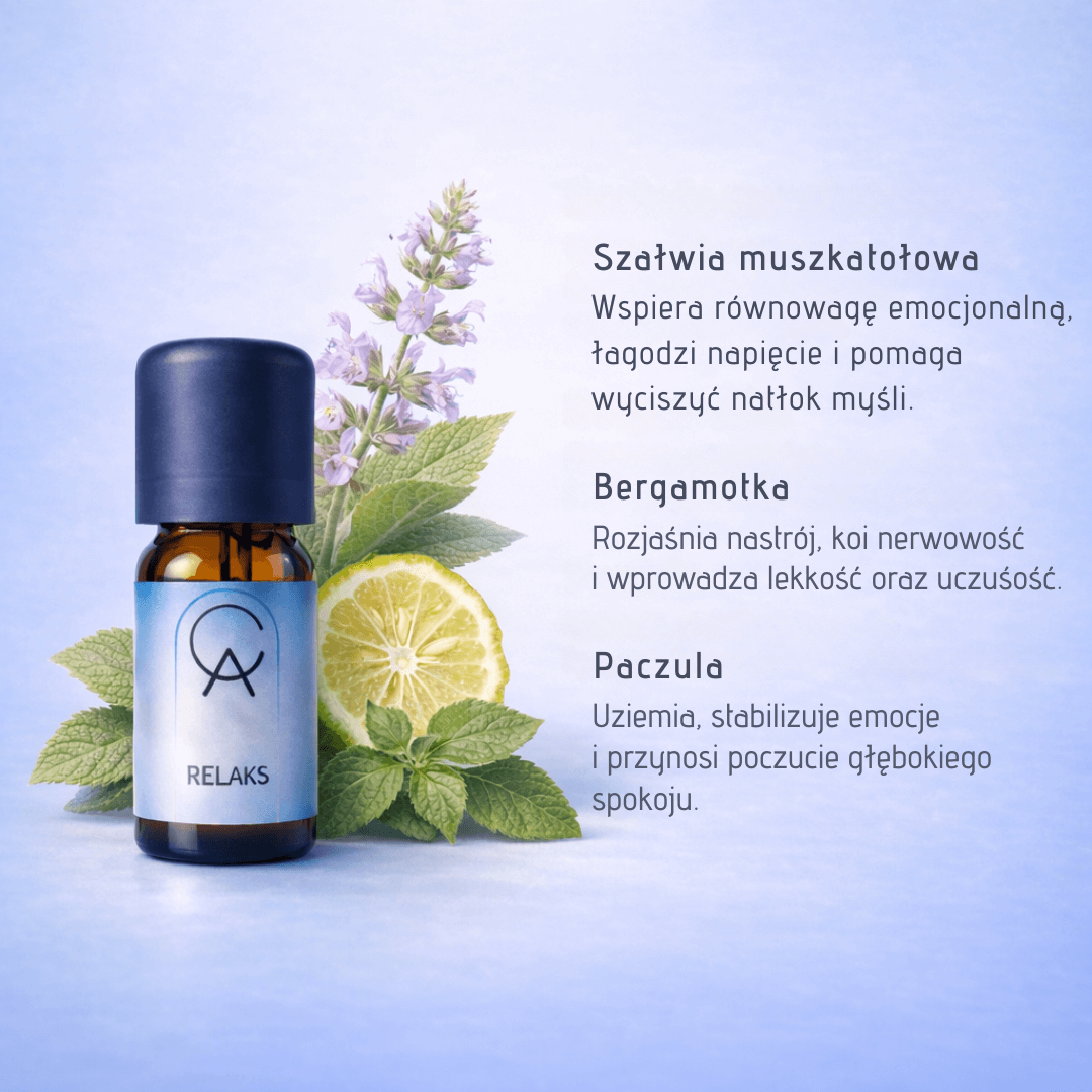 Olejek eteryczny RELAKS został stworzony z myślą o codziennym wsparciu w radzeniu sobie ze stresem. Starannie dobrane składniki o ciepłych, ziołowych i cytrusowych nutach pomagają odprężyć ciało, zharmonizować emocje i odzyskać wewnętrzny balans.
